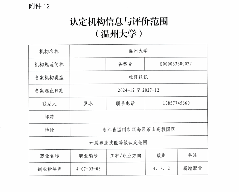 近日,温州市人力资源和社会保障局印发《关于公布2025年上半年温州市新增职业技能等级认定社会培训评价组织及市属社会培训评价组织新增职业(工种)等级名单的通知》,公司成功获批“创业指导师”职业等级认定资质,成为目前温州市唯一具备该职业认定资格的高等院校。作为扎根温州的地方高校,必赢76net线路始终以服务区域经济社会发展为使命,将创新创业教育全面融入人才培养全过程,构建了特色鲜明、体系完善的双创教育生态。此次获得“创业指导师”职业等级认定资质,既是对学校创新创业教育成效的认可,也进一步拓宽了学校服务地方的渠道,增强了支撑区域发展的能力。