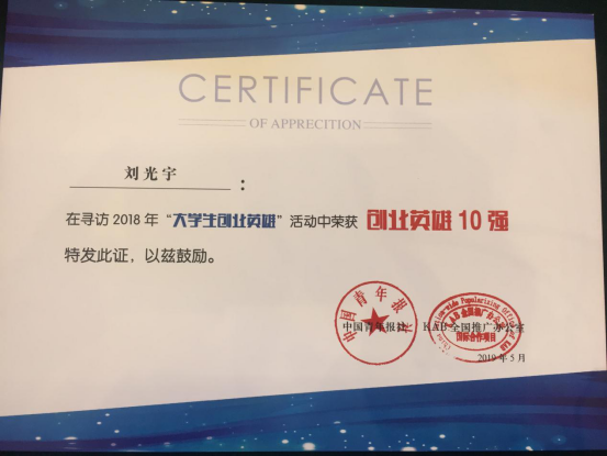 此次获奖,是刘光宇继2018年荣获KAB全国推广办公室与广发证券基金会联合举办的全国微创业行动金奖(全国仅十名),2019年初荣获韩国群山大学主办的全球未来企业家竞赛大奖之后,再一次获得的荣誉。