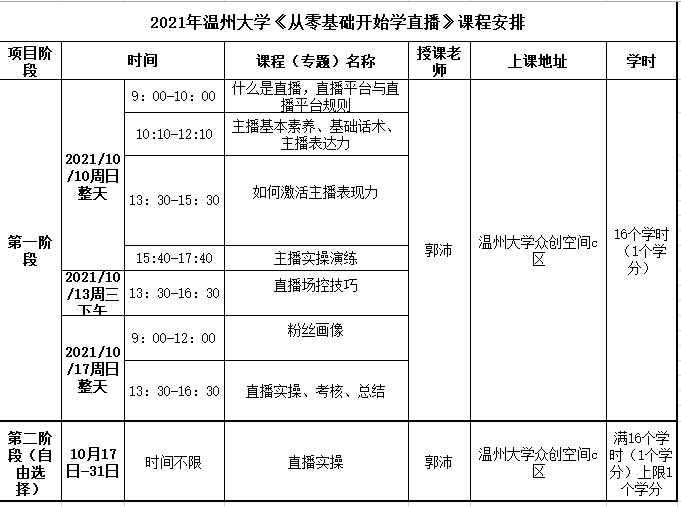 1.授课安排在2021年10月周末。